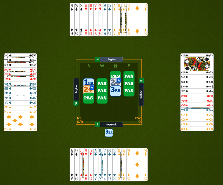 Po wzięciu lewy gramy waleta kier, damę bijemy asem i gramy kiera do dziewiątki. W bierze asem i niestety nie kontynuuje trefli.
